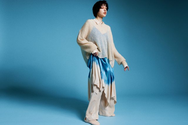 23awでは、やんばる地方の本部半島で採取したピンク土でムラ染めを行いました。顔料染めは、紫外線に強く、発色もはっきりしていて色を重ねても滲みにくくいのが特徴で、沖縄のマージ染めは明るい透明感のある仕上がりが大きな魅力です。基布には山梨産のオーガニックコットンを使ったベロアを使用し、温かみのあるジャケットとパンツのセットアップを制作しました。